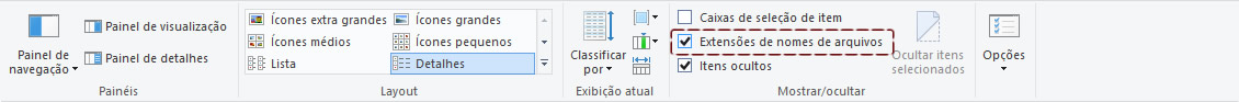 - Abra a pasta onde você salvou o arquivo de firmware. Em seguida, clique na opção Exibir no menu do Windows Explorer e ative a opção Extensões de nome de arquivo.