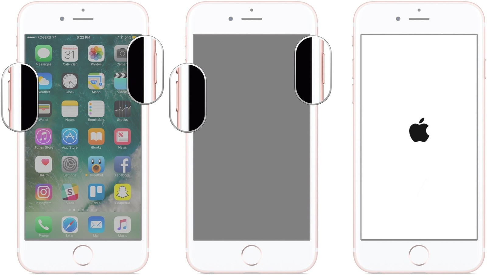 - Segure os dois botões enquanto a tela se apaga e continue segurando até que a tela ligue novamente e exiba o logotipo da Apple.