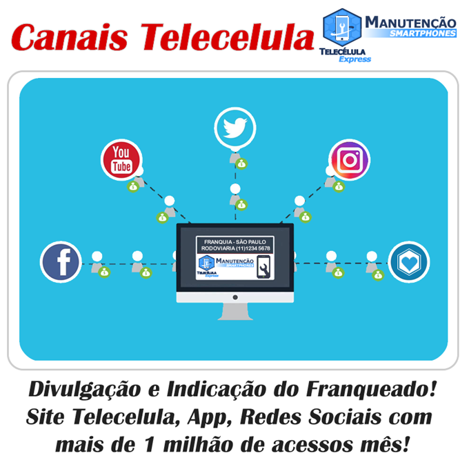 Acesso ao site do franqueador com destaque e direcionamento de clientes da sua região, através de todas midas da empresa (facebook, youtube, Instagram, tweeter, etc…) com propaganda destacada direcionando reparos solicitados para a unidade franqueada, acesso as redes sócias e canal do youtube (videcélula) com direcionamento de serviços.
