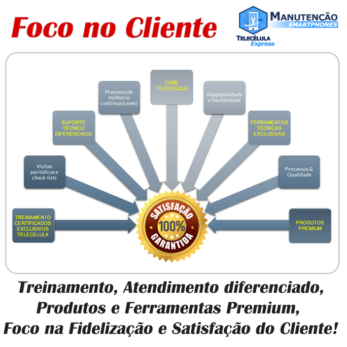 A sua franquia será sinônimo de qualidade, tudo deve inspirar qualidade e transparência, jogando limpo com nosso cliente, focar na solução efetiva do problema, sempre com o maior carinho, fazendo o serviço com excelência rapidez e qualidade, foco no padrão de fábrica! Todo reparo oferecido pela rede tem garantia mínima de 90 dias, cobrindo totalmente o smartphone neste período, afinal os reparos englobam a manutenção corretiva e preventiva, que é o padrão de reparo da rede. Excluem-se os aparelhos danificados por contato com liquido, quebrados, ou que se enquadrem nos termos de garantia geral.
