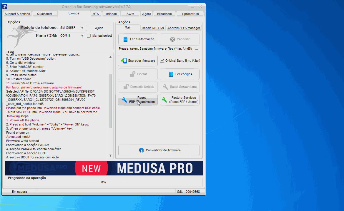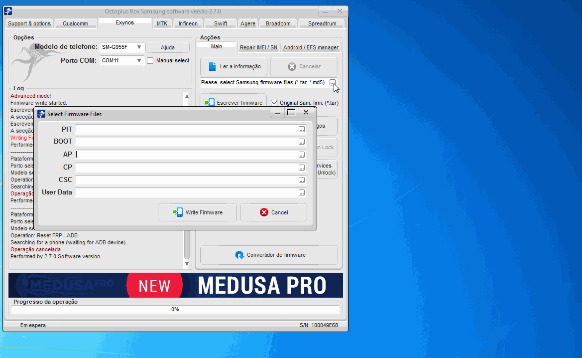 1- Conecte sua box e abra o programa Octoplus Samsung. Agora, escolha o modelo do atc (g955 ou g950f), escolha a combinação referente ao modelo e versão do binário e mande gravar a flash clicando em WRITE FIRMWARE.